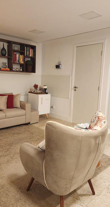 • Tratamento Acústico: O consultório conta com um tratamento acústico especial, garantindo que suas conversas permaneçam privadas e que você possa se expressar livremente, sem preocupações.